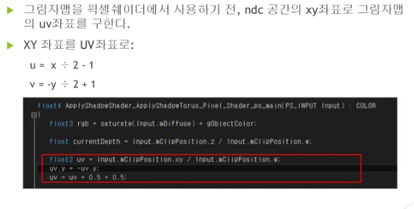 그리고 PS에서 저장한값을 꺼내서 xy값은 광원깊이맵을 샘플링하기위해 깊이맵의 UV좌표로 변환한다.