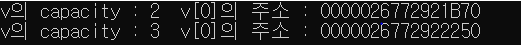 cout << "v의 capacity : " << v.capacity() << " v[0]의 주소 : " << &v[0] << endl;