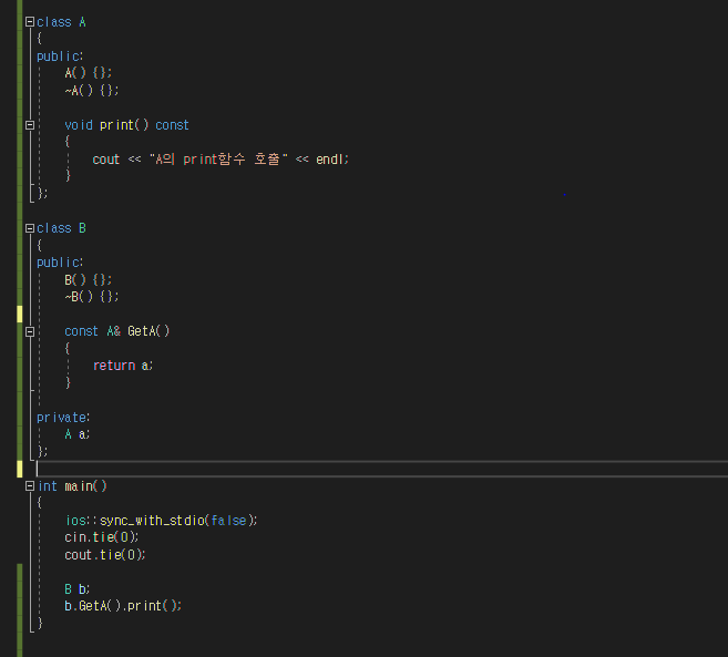위 코드는 그냥 예시용 코드긴 한데, A클래스의 print에 const가 붙어있는 이유는, GetA()는 결국 const 객체의 참조자를 리턴하는 것이기 때문이다. const객체는 const 멤버함수만 호출할 수 있기 때문에, print함수에 const키워드가 반드시 붙어있어야 한다.