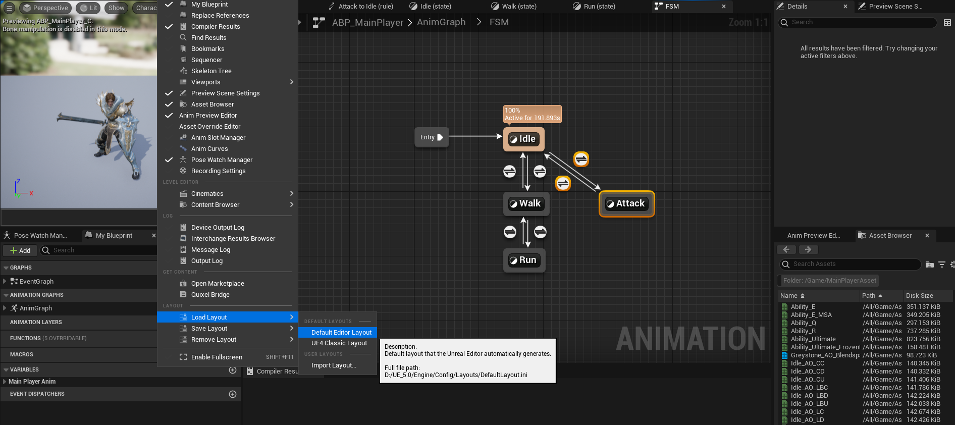 마찬가지로 Window탭을 누르고 최하단쪽 보면 'Load Layout'이 있고, 마우스를 갖다대면 'Default Editor Layout'이 있다.