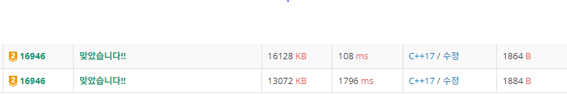 밑의 1796ms가 BFS내부에 visited를 만들어서 제출한 코드고, 108ms가 전역으로 visited해서 제출한 코드다.