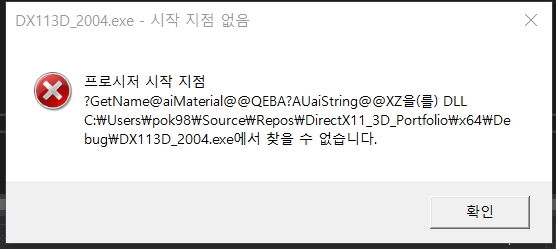 얼추 해석하면 aiMaterial::GetName()이라는 함수를 해당경로의 DLL파일에서 못찾는다..는 내용 같았다.