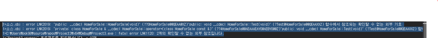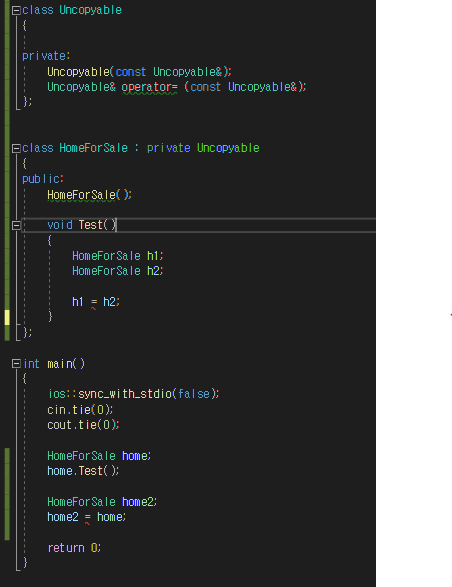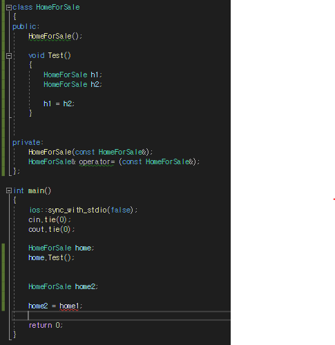 여기보면 main함수에서 HomeForSale클래스의 객체를 만든 후, 복사대입연산자를하면 컴파일에러를 띄워준다.